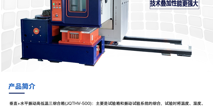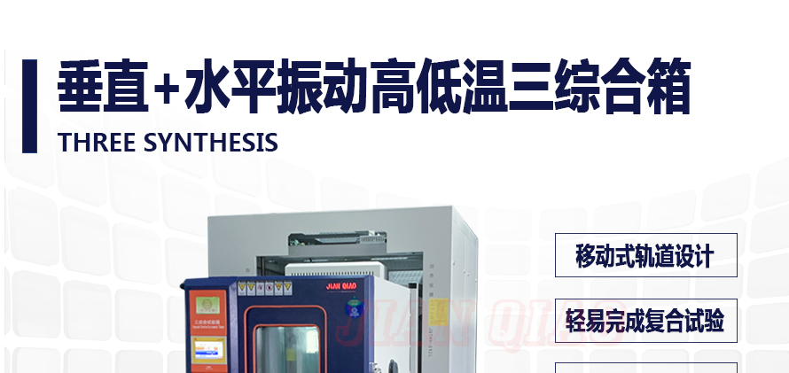 產品型號:JQTHV-500 品牌:劍 喬 用途:垂直+水平振動高低溫三綜合箱(JQTHV-500):主要是試驗箱和振動試驗系統的綜合,試驗時將溫度、濕度、振動(高溫或低溫),(正弦振動或隨機振動)以及電應力按規定的周期綜合在同